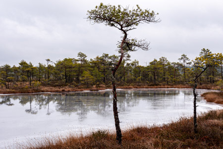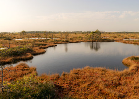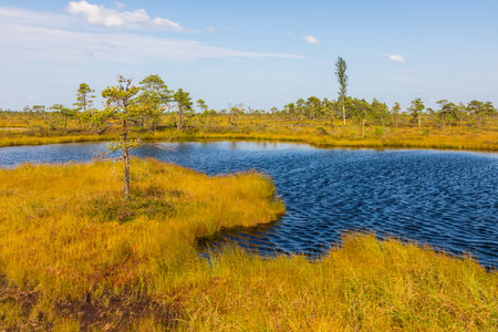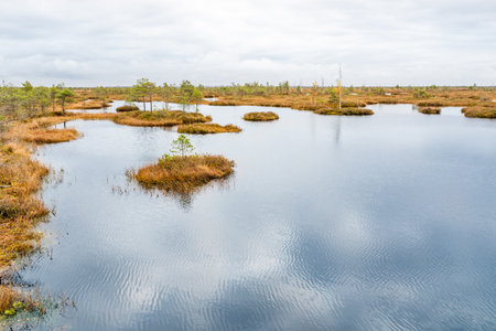 bog landscape, bog vegetation painted in autumn, small swamp lakes, islands overgrown with small bog pines, grass, moss cover the ground, Kemeri National Park, Latvia