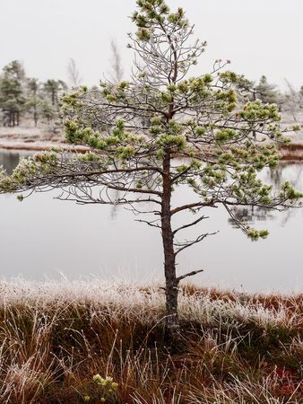 Pine Trees in Field of Kemeri moor in Latvia with a Pond in a Background on a Cold Winter Morning with some Frost on them