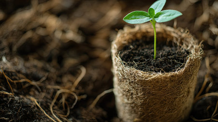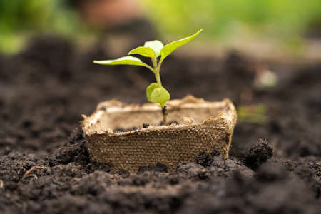Young fresh seedlings growing in biodegradable pot, home gardening.