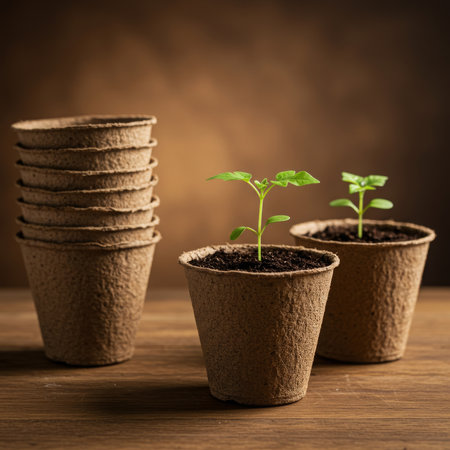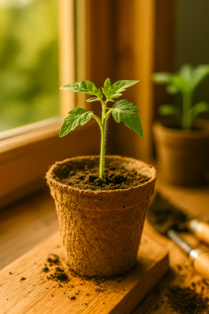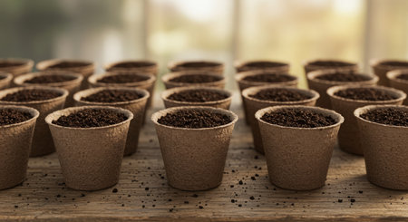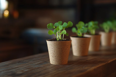 biodegradable seed pots under natural light with new plants next to window ready for new season home gardening