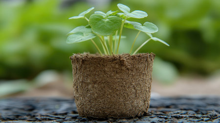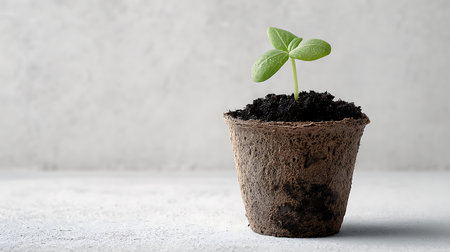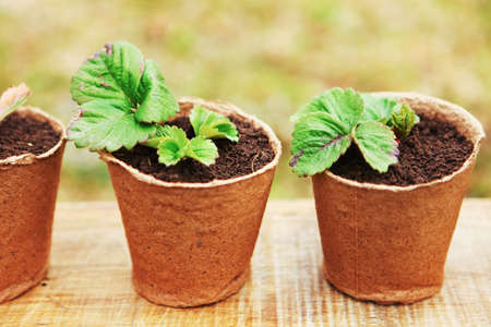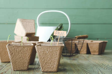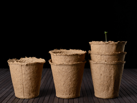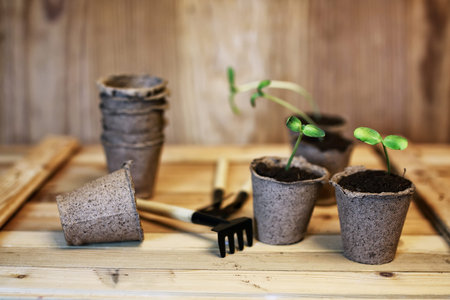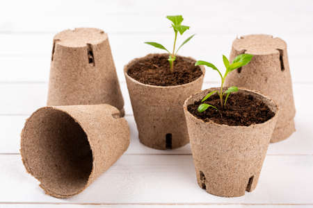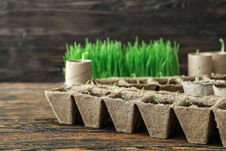 Potted seedlings growing in biodegradable peat moss pot on wooden background