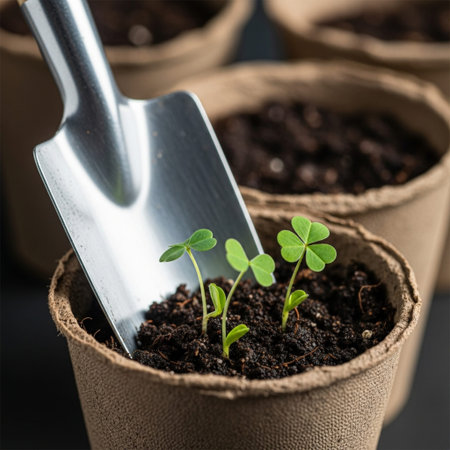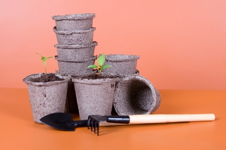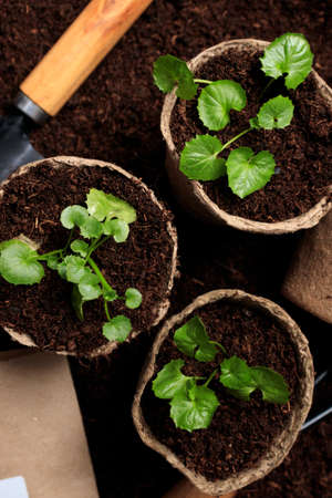 Green young seedling in a pot and gardening tools. Planting plant seeds and sapling in fertile soil in spring.