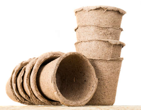 Pots for seedlings of ecological cardboard. Peat seed pots. Pots on isolated white background