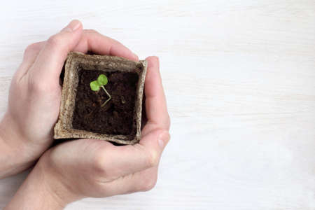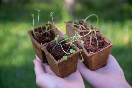 Seedlings in peat pots. Baby plants seeding. Spring planting. Early sprouts, grown from seeds in boxes at home. Agriculture, organic gardening, planting or ecology concept. New life concept.