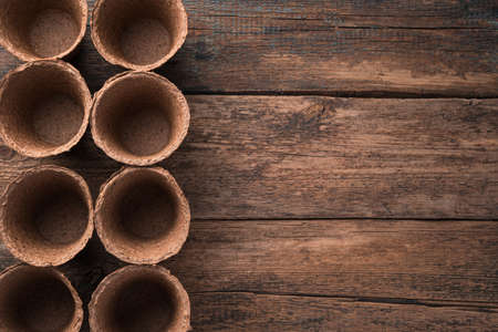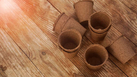 Empty peat pots for seedlings on a wooden background. Gardening. The concept of preparing garden tools for the spring planting of plants and flowers