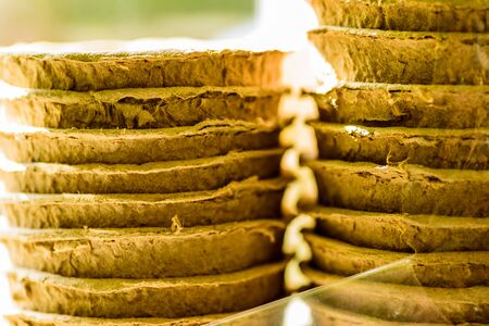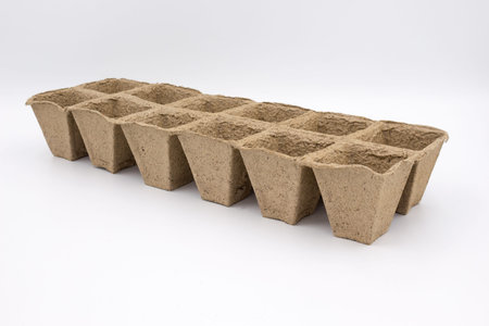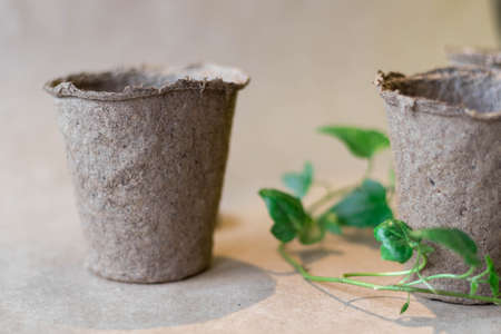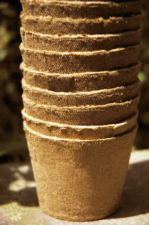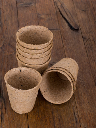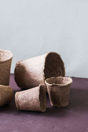 Empty, folded peat cups for seedlings on a brown background. The concept of cultivation.