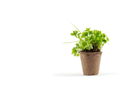 one green plant of pepper seedlings in a peat pot close-up and isolated on an empty and clean background