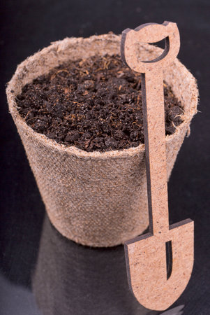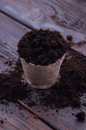 Round fibre pot overfilled with soil. Close-up. Wooden background.