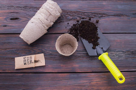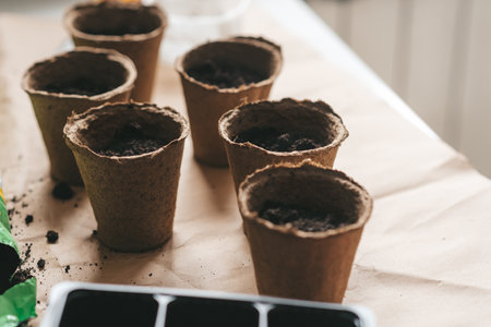 Planting tomato seedlings in peat pots at home. Garden tools. Growing domestic herbs and vegetables.