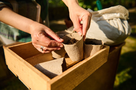 Close-up farmers hands hold disposable peat pot with fertilized soil over wooden crate. Organic farming food production. Growing organic vegetables in greenhouse condition. Gardening and Agriculture