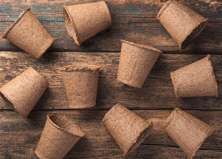 Background with randomly arranged peat pots on a wooden table. Top view. The concept of cultivation.