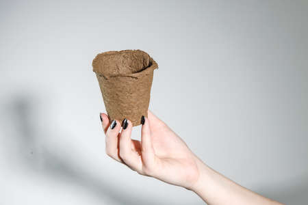 Fragment. A female hand with a black manicure holds a peat pot for planting seeds against a white wall. Place for text