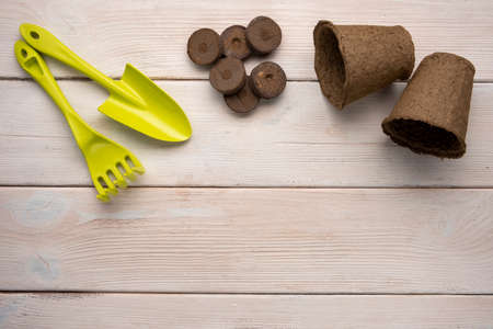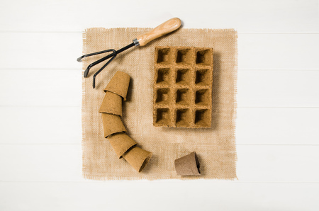 Gardening at home. Tools, peat pots and pressed ground for seedlings on white wooden background
