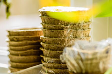 Pepper seedlings in peat pots on the window. Natural light from the window. Crop production in the house
