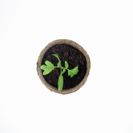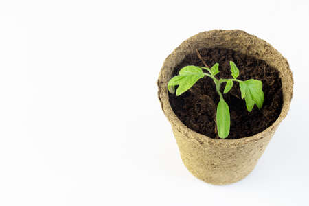 The process of growing seedlings at home. Pot with tomato seedlings isolated on white background. Agriculture. Top view