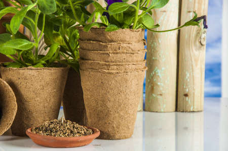 Peat pots for spring gardening.On wooden bench. Vertical.