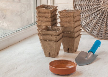 Biodegradable peat pots, seedling planting tools and pressed ground on white background with copy space. The concept of growing food, plant on the windowsill and in the greenhouse.