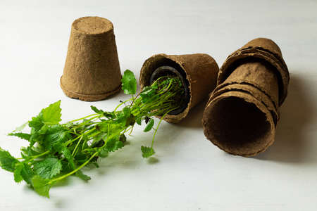 Potted seedling growing in biodegradable peat moss. Pot was left on the box with soil, roots were growing immediately. Rooting plant of Monarda didyma, bergamot, in the pot.