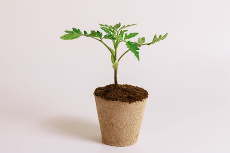 The process of growing seedlings at home. Pot with tomato seedlings isolated on white background. Agriculture.