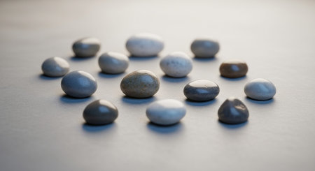 Smooth river stones are neatly arranged on a white surface under soft lighting, creating a calm and neutral atmosphere that invites reflection.