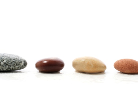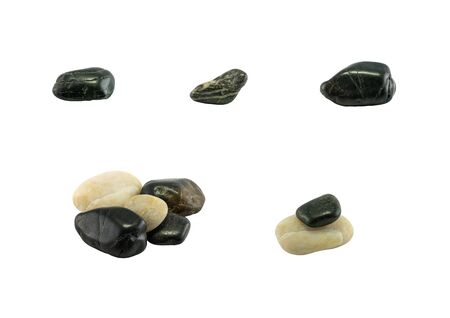 Assortment of natural rocks and pebbles grouped together, white backdrop