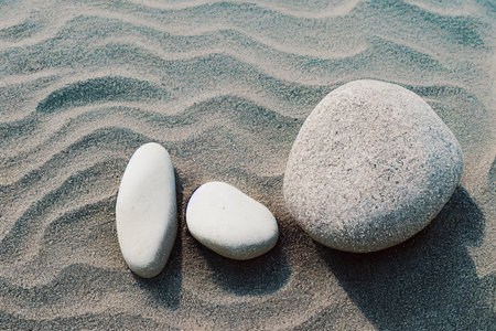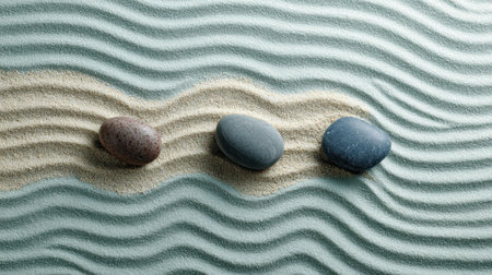 Three smooth stones are arranged thoughtfully on soft, raked sand, creating a peaceful atmosphere in a zen garden. The subtle patterns in the sand enhance the sense of tranquility and harmony.
