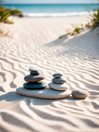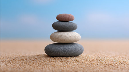 This image features a serene arrangement of smooth stones stacked on a sandy beach, symbolizing balance and tranquility against a clear blue sky.