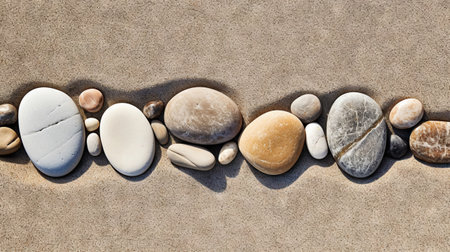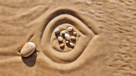 Pebble stones lie on the sand in definite order. Zen meditation. Generative AI.