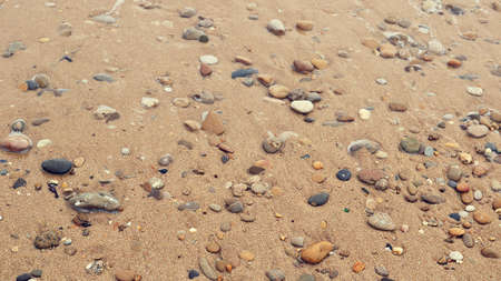 texture of wet sand of a beach with round colorful stones next to the sea