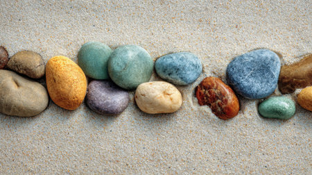 Smooth, colorful stones scattered on sandy beach surface