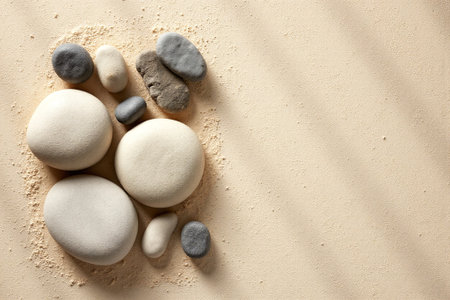 zen stones on sand background, top view, flat lay, copy space
