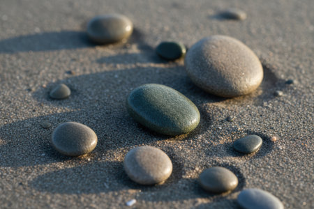 A serene arrangement of smooth pebbles in varying shades on a light sand surface, casting gentle shadows. Ideal for themes of tranquility and nature.