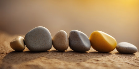 AI Generated. A closeup shot of seven smooth stones arranged in a line on a bright yellow background