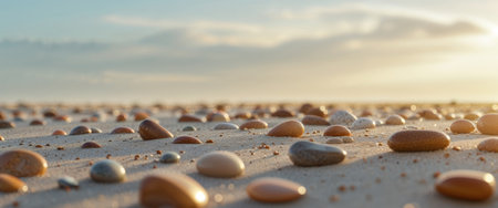 AI Generated. Golden Sunlight Illuminating Sandy Shore with Scattered Pebbles in Natural Scene