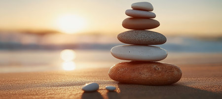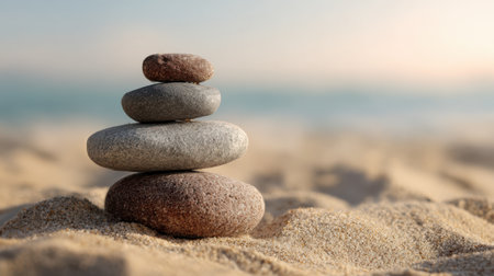 Tranquil Morning at the Beach Serene Stack of Balanced Rocks for Zen Meditation and Harmony