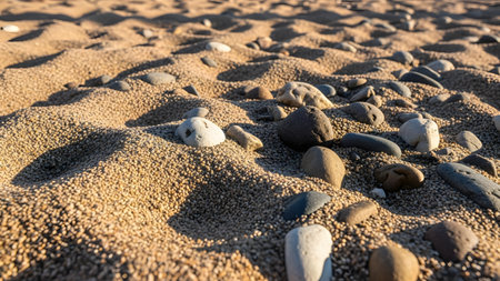 A captivating close-up of colorful pebbles and stones scattered on a sandy shore illuminated by soft sunlight, creating a serene natural ambiance.