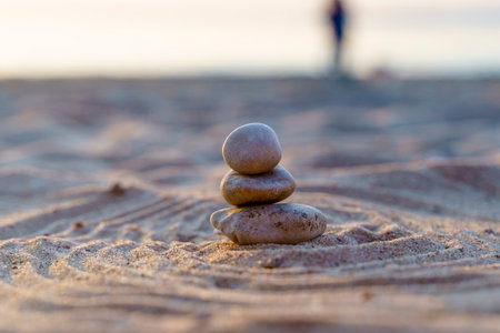 Rock balancing on ocean beach. Pyramid of pebbles on sandy shore. Stable pile or heap in soft focus with bokeh, close up. Zen balance, minimalism, harmony and peace