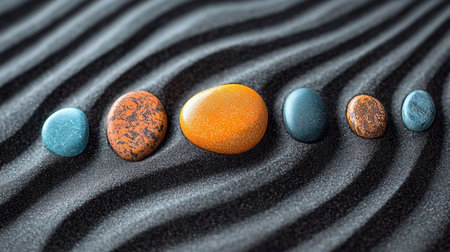 Discover a captivating image featuring smooth stones placed on gently raked sand, evoking feelings of serenity and tranquility in a natural landscape. Perfect for relaxation themes.
