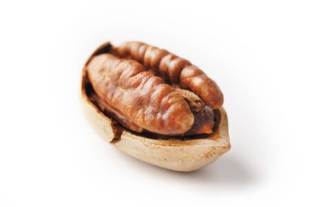 Pecan isolated on white background. Close-up, macro. A nut in a shell. Pecans are rich in various trace elements and vitamins