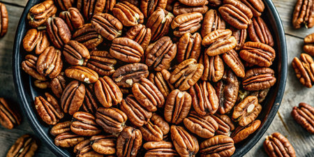 Dry organic Pecan Nuts top view background. Healthy nuts. Generative AI.