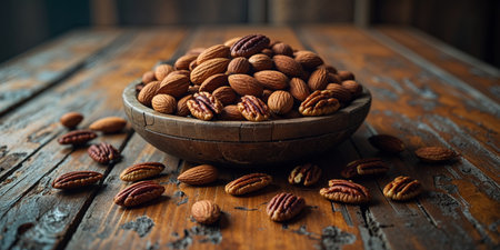 AI Generated. Rustic Wooden Bowl of Mixed Nuts on Table