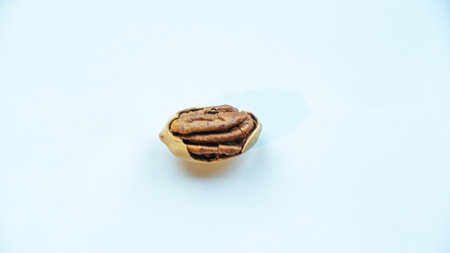 Single pecan nut with medium brown shell cracked open to expose the golden brown kernel inside isolated on a plain surface highlighting the nuts texture and natural split