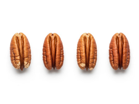 Closeup of raw pecan nuts arranged on white background in minimal composition.