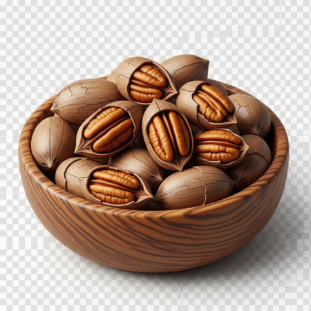 A close-up view of a rustic wooden bowl brimming with whole, unshelled pecan nuts, showcasing their rich texture and color.