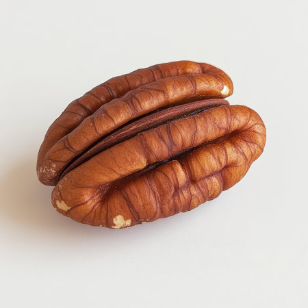 A single roasted pecan lies on a neutral background, highlighting its unique textured surface and deep brown color, emphasizing its natural beauty and nutritious appeal.