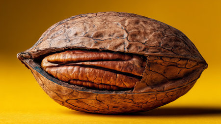 Single Pecan Nut, Close Up on Yellow Background, Rich Brown Tones, Textured Shell, Healthy Snack