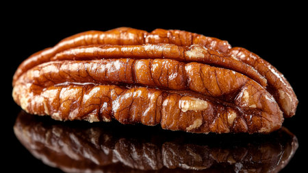 Stunning Close-Up of a Raw Organic Single Pecan Nut Isolated on Refractive Black Background