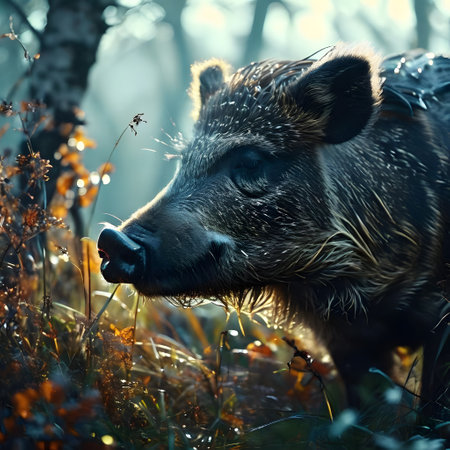 Two wild boars emerge from the fog in a European forest. The sun shines through the trees, casting a warm glow on the animals. The boars have a serious look on their faces, as if they are on the hunt.