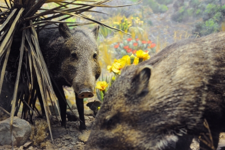 Collared peccary or javelina. Collared peccaries are pig-like animals that inhabit the deserts.
