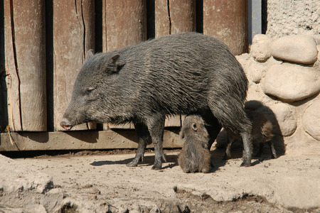 Collared peccary (Pecari tajacu) feeding its little piglets.